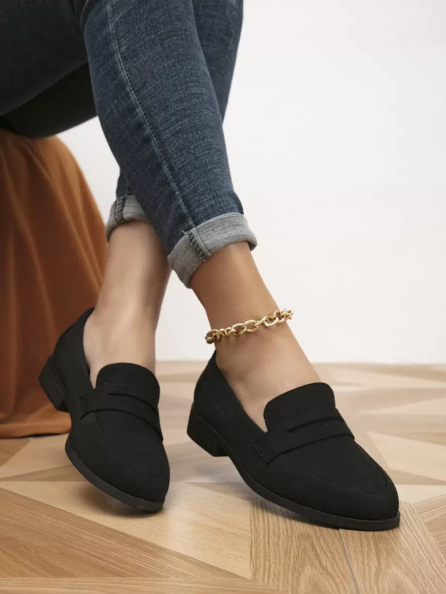 Women's Black Faux Suede Flat Shoes, Fashionable Pointed Toe Loafers, Autumn/Winter