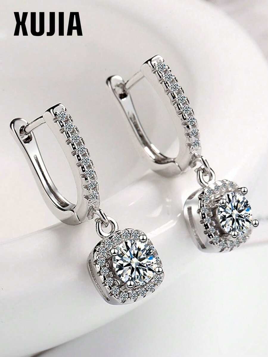 XUJIA 1 Pair 925 Sterling Silver Halo Moissanite Earrings, 6.5mm/8mm/9mm Moissanite, D Color VVS1 Round Cut, Dangle Earrings, Birthday Gift, Moissanite Center Stone, Surrounded By Cubic Zirconia