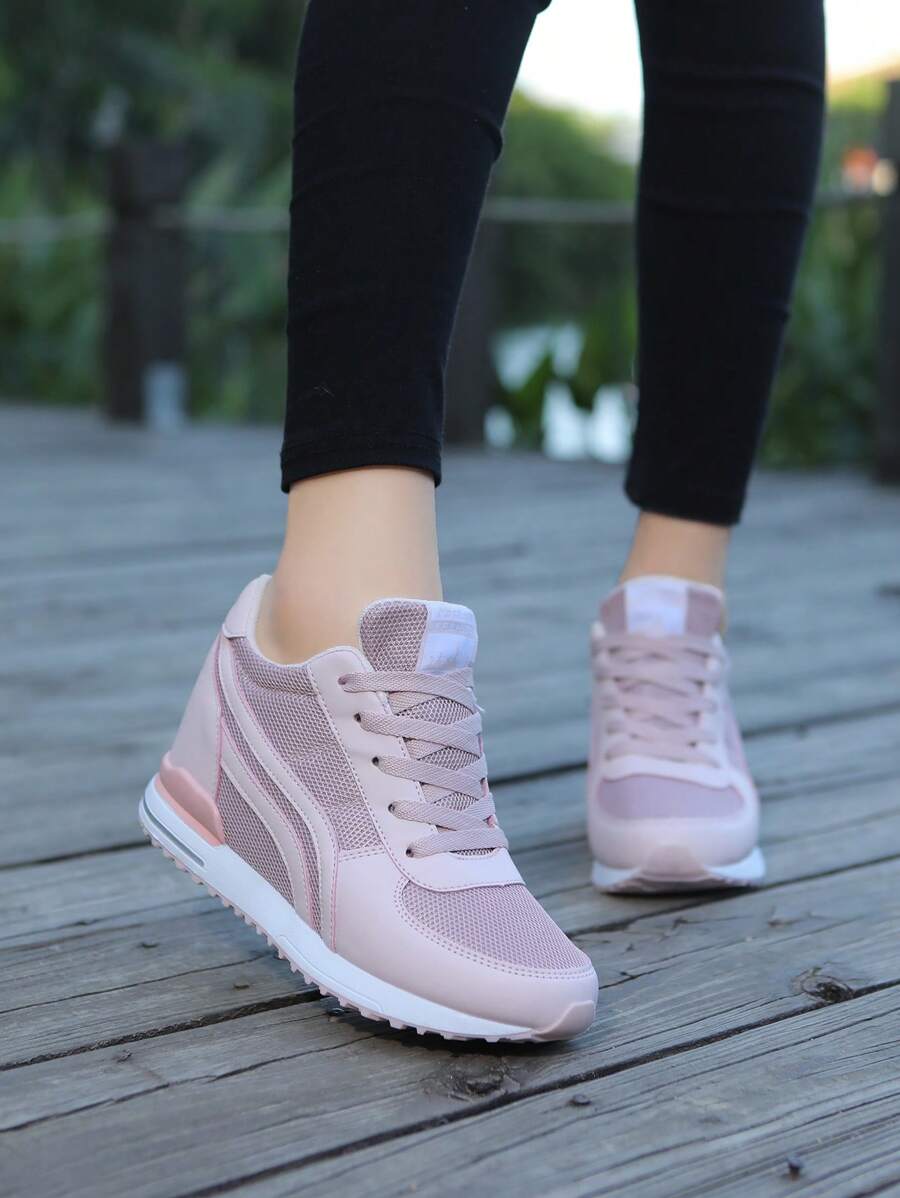Fall/Winter Women's Solid Color Mesh Sneakers, Lace Up Patent Leather Decor Heightening Sporty Trainers, Versatile Breathable Comfy Shoes