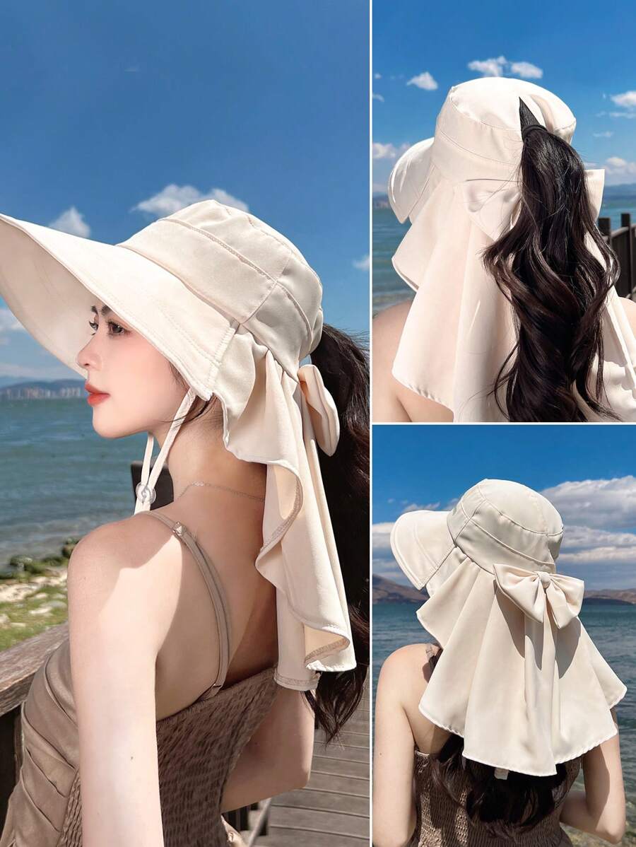 1pc Women's Spring/Summer Outdoor Wide Brim Sun Hat, Korean Fashion Poncho Style With Hole For Ponytail