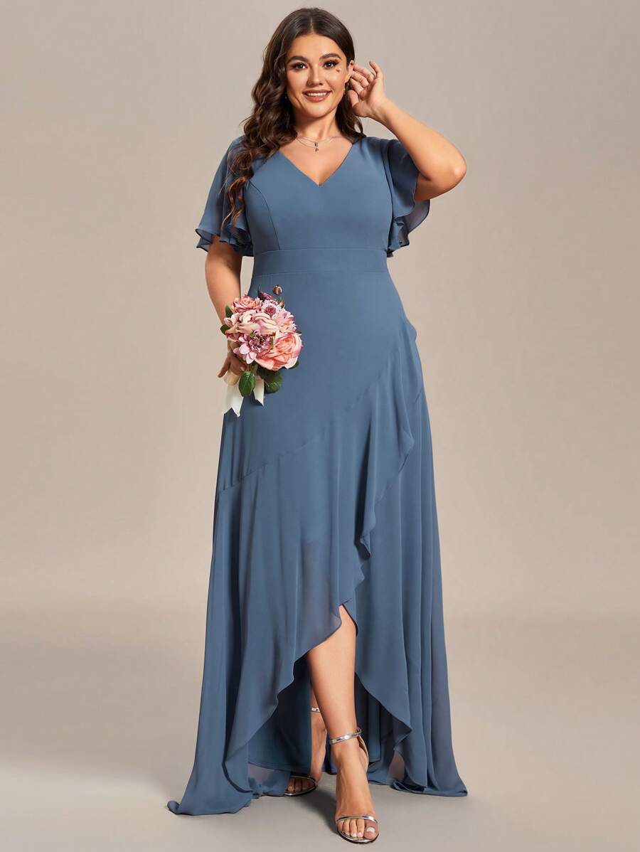 Plus Size V-Neck Asymmetrical Ruffle Hem Chiffon Dusty Blue Bridesmaid Dresses Fall Wedding Guest Dresses