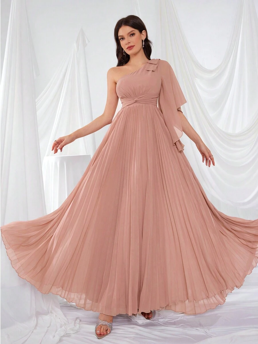 UNITHORSE Asymmetrical Neck Bowknot Flare Sleeve Pleated Waist Elegant And Graceful Party Dress Bridesmaid Dress