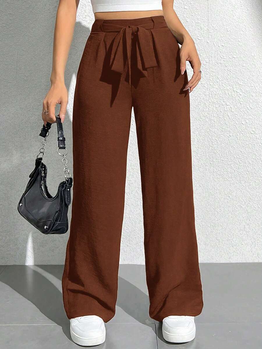 SHEIN PETITE Solid Color Tie Waist Wide Leg Pants, Long