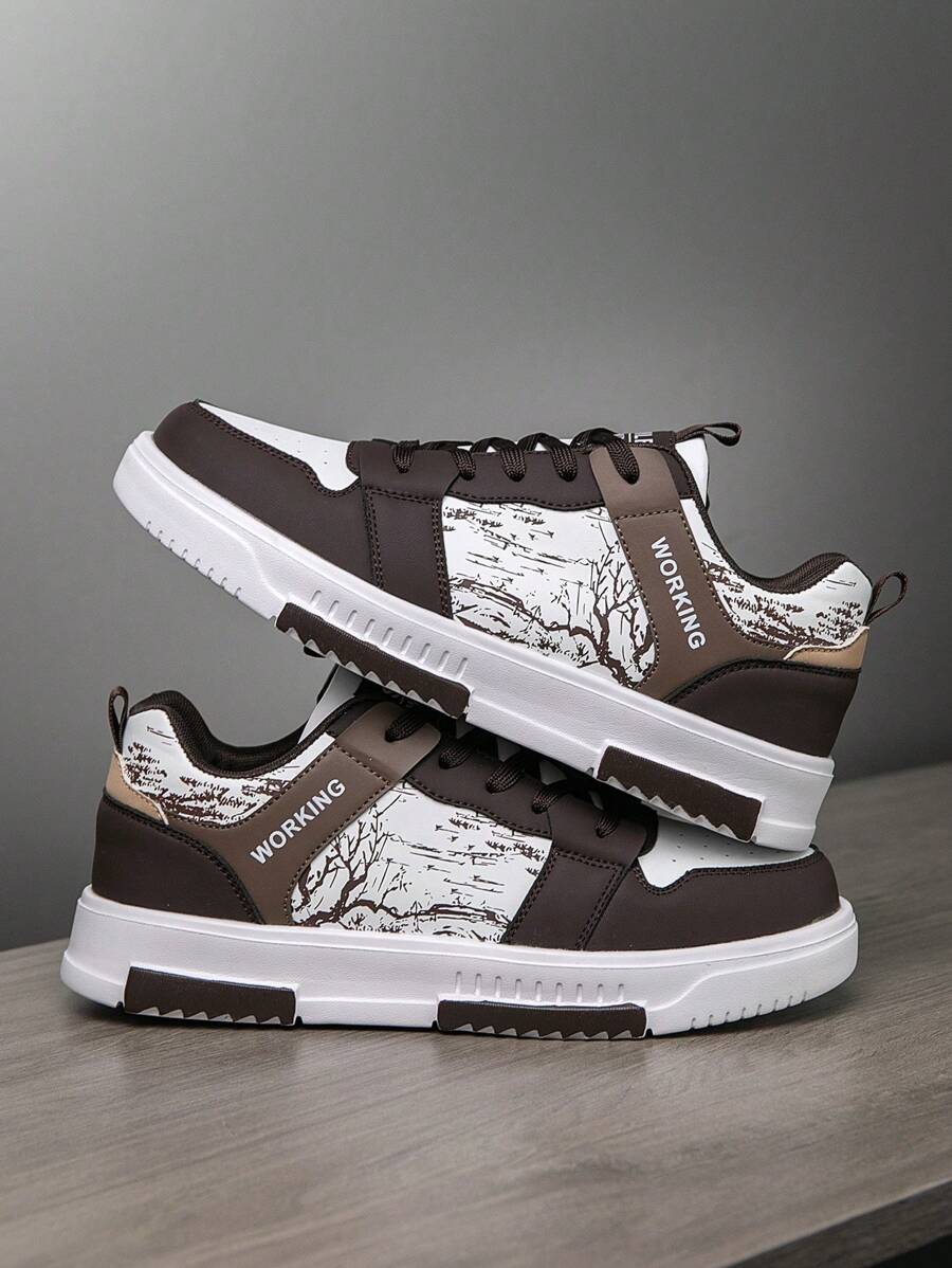 Men's Fashion Contrast Color Letter Random Print Patchwork Lace-Up Low-Top Sneakers, Personalized Casual Outdoor Comfortable Sports Shoes For Teenagers