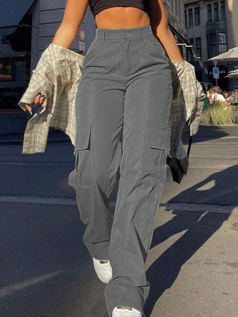Flap Pocket Solid Color Cargo Pants, Y2K Slant Pocket Button Front Every Day Pants, Women's Clothing