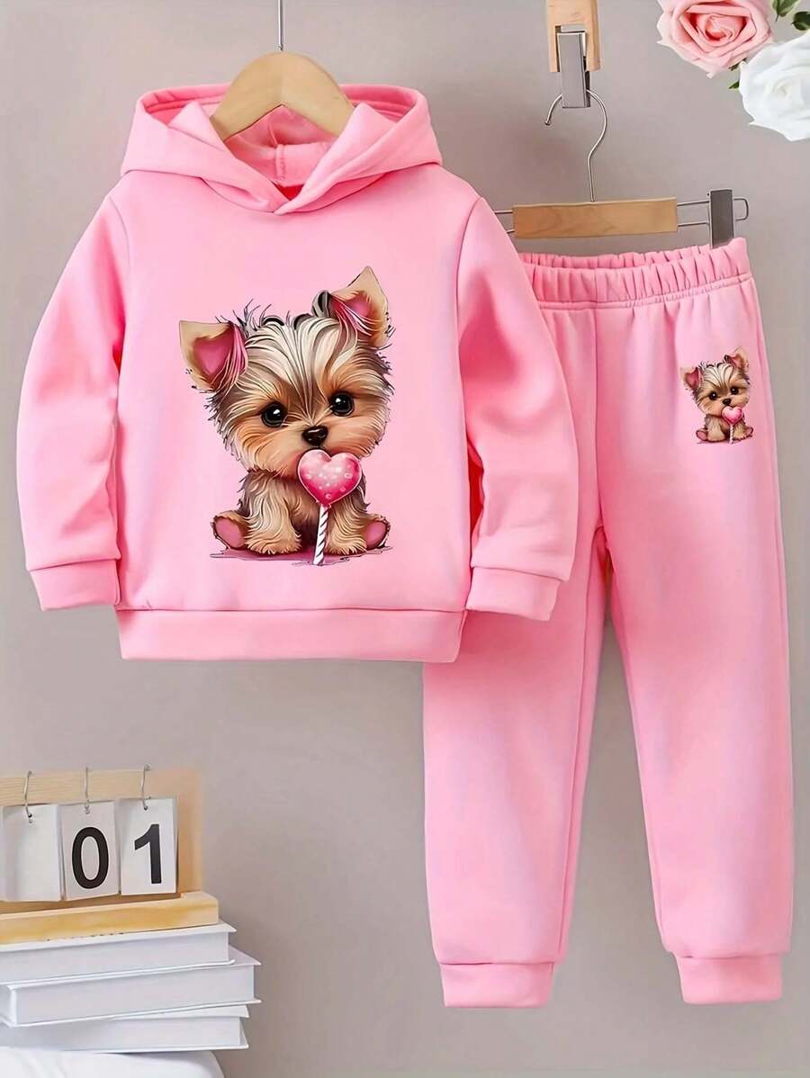 2pcs/Set Toddler Girls Fashionable Cute Sports Outdoor Gentle Sweet Casual Minimalist Cartoon Puppy Heart Lollipop Print Hoodie Sweatshirt And Pants Set, Autumn/Winter