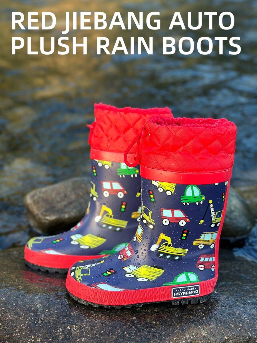 Kids' Fashionable Rubber Cartoon Rain Boots, Comfortable Anti-Slip With Warm Plush Lining, Suitable For Winter Rainy Season Wear And Play