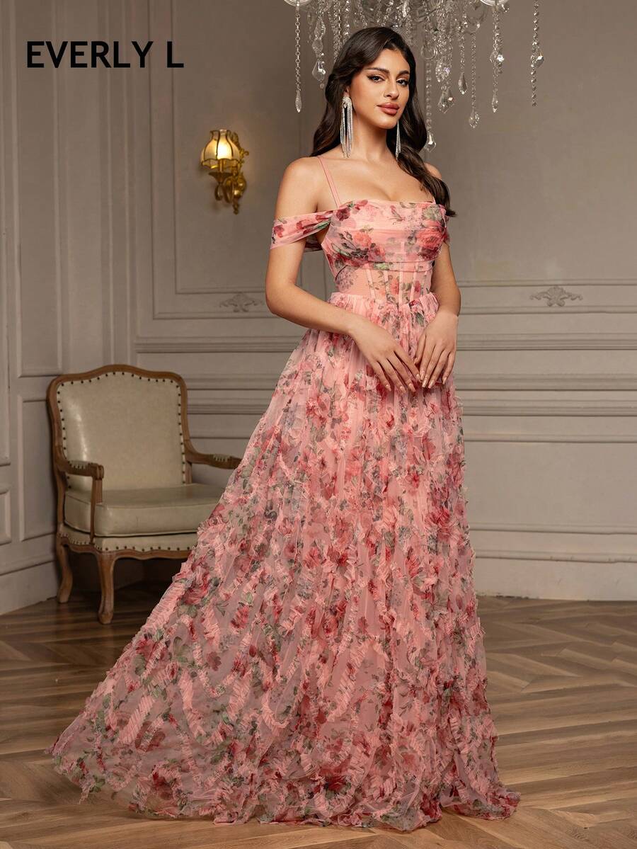 EVERLYL Everly L Women's Tiered Floral Mesh Strapless Backless Off-Shoulder Dress Perfect For Prom And Weddings