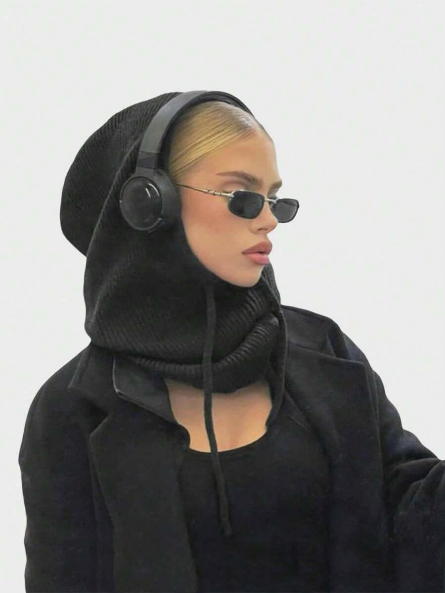 1pc Women's Black Balaclava Hat With Drawstring Detachable Collar, Wool Bareshoulders Hat For Outdoor Skiing, Knitted Face & Neck Protective Hood Cape, Suitable For Winter