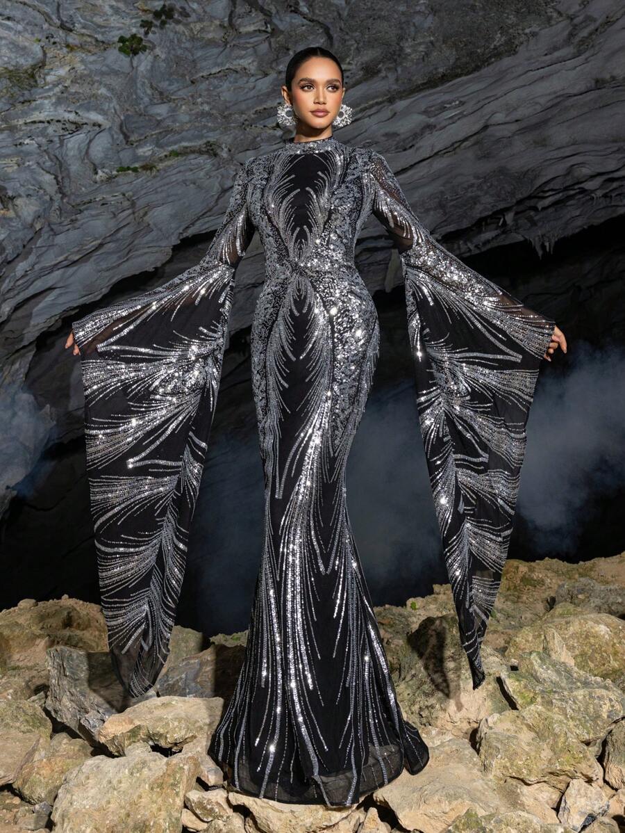 Faeriesty Glamorous Bell Sleeve Extra Long Sleeve Sequin Print Formal Party Dress, Wedding Guest Dress, Evening Gown