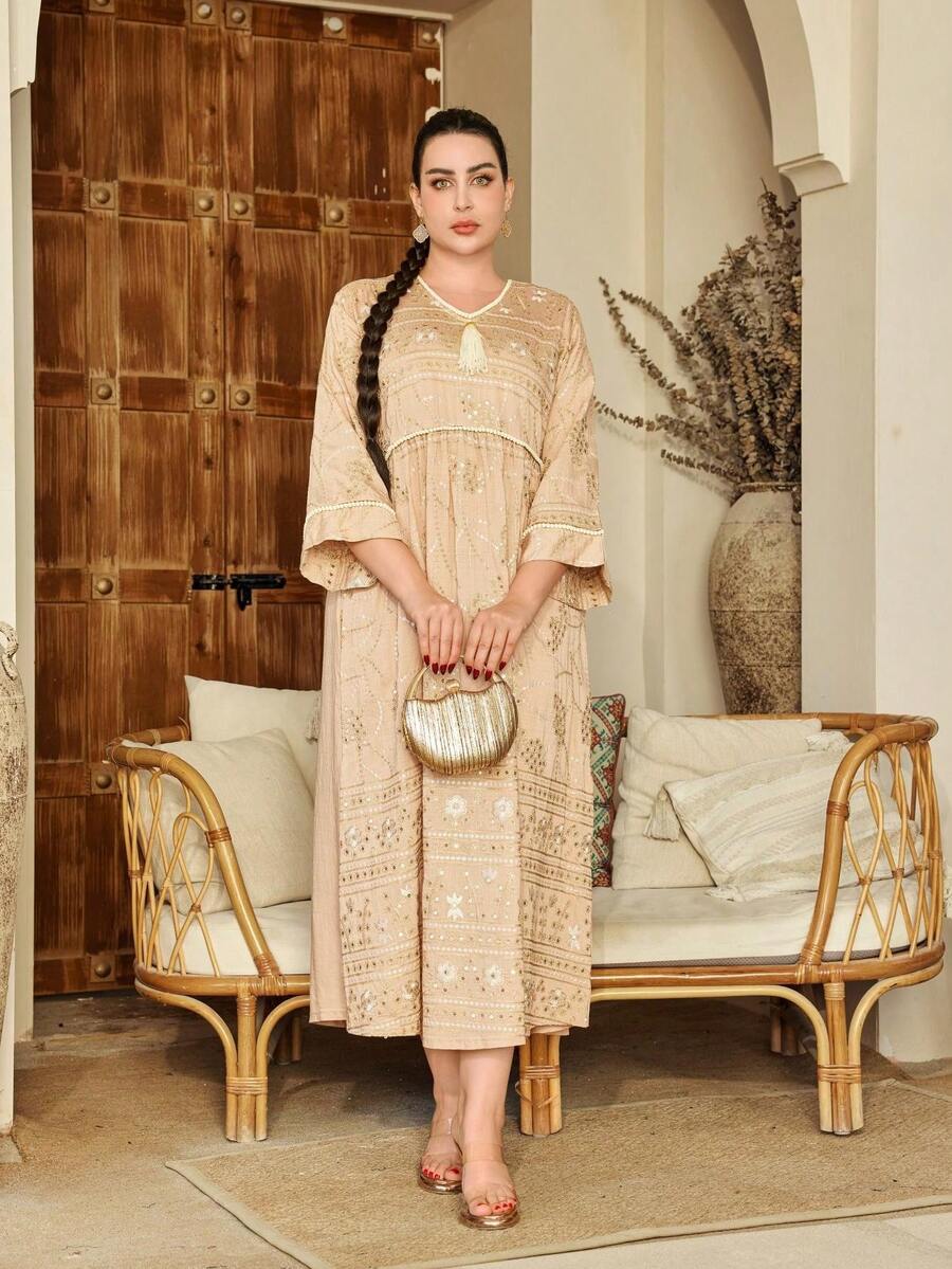 Elegant Women's Arabic Embroidered Beaded Golden Dress With Tassel Pompom Trim, V-Neck, 3/4 Sleeve, Fashionable And Graceful, Spring/Summer 2025. RAMADAN, Eid Al Adha (Not Positioned Printed, Random Cut), Modest Kaftan