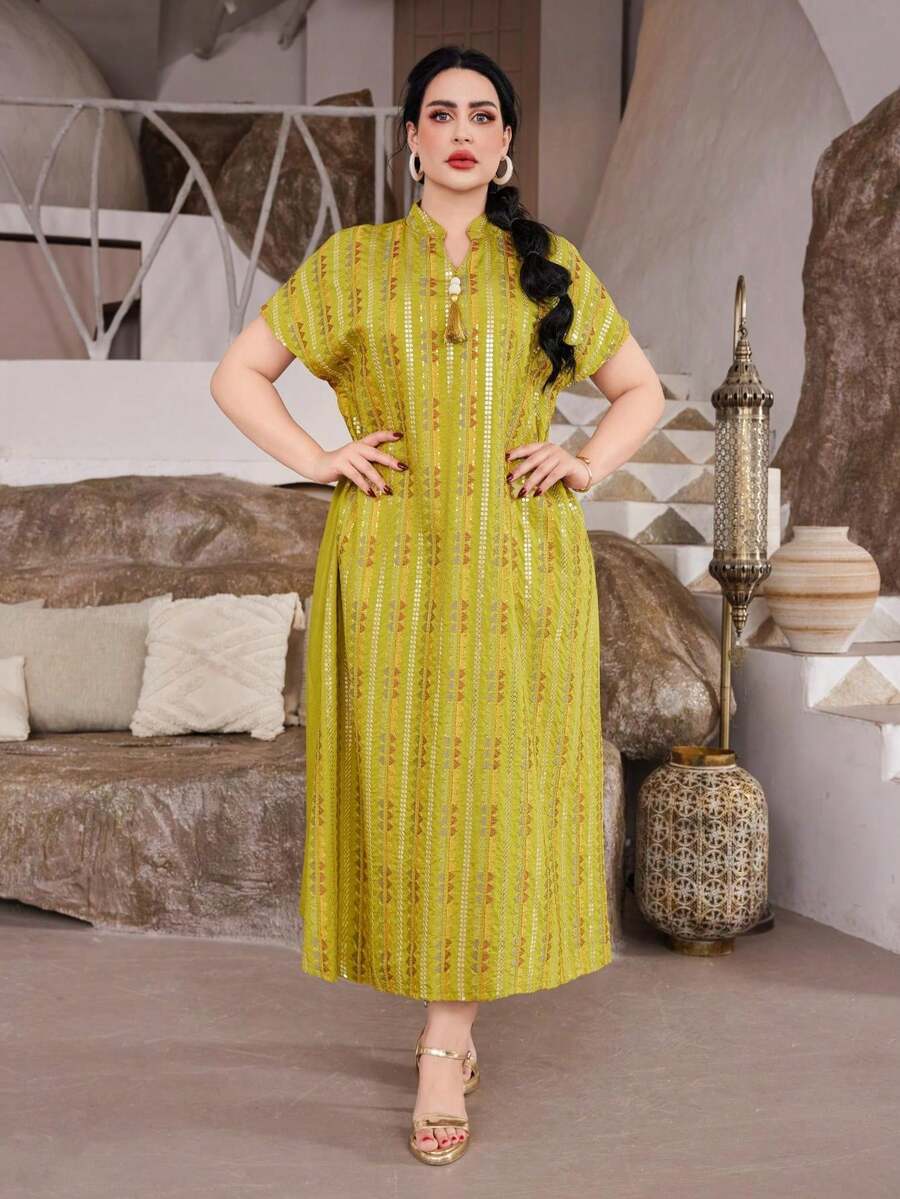 Elegant Arabic Women's V-Neck Dress With Embroidery & Metallic Threads, Graceful & High-End, Green Color, Spring/Summer 2025, Ramadan