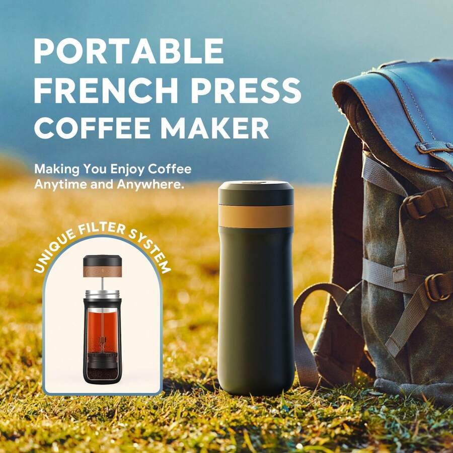 iCafilas 320ml/11oz Portable Coffee Pot French Press Flask Coffee Maker Stainless Steel Insulated Travel Mug With Coffee Plunger Filter Black Outdoor Camping