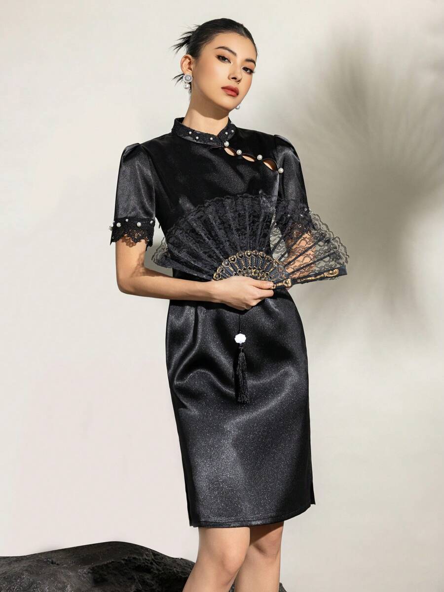 Connect Lace Short Sleeve Stand Collar Pearl Trim Satin New Chinese Style Cheongsam Qipao Dress