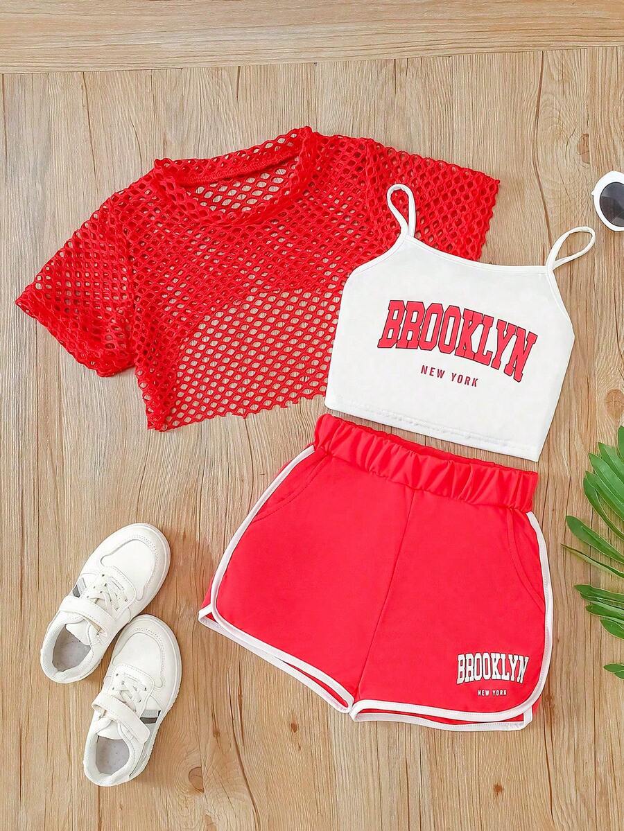 3pcs Tween Girl Brooklyn Letter Print Camisole + Mesh Overlay Top + Shorts Outfit, Summer Outdoor Fashion Set, Suitable For Outdoor, Summer Gift