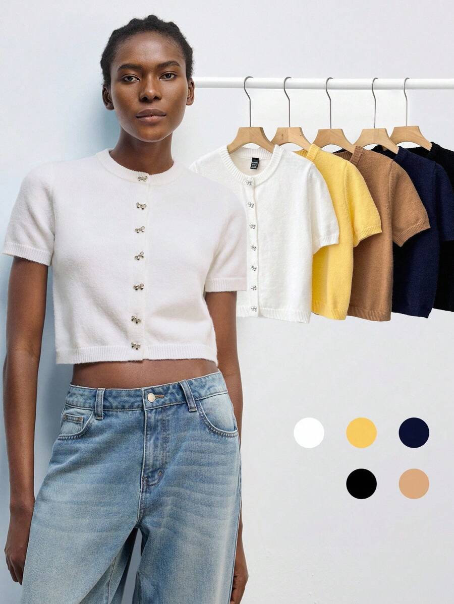 Maija 2026 Spring & Summer Outfits New All-White Knitted Crochet Round Neck Front Open Single-Breasted Metal Bow Button Soft Cardigan Sweater, Modern Elegant Urban Romantic Western Punk Country Music Festival Vintage Style Travel Street Wedding Guest Birthday Business Casual Office Date Party Outing Airport Back To School,Valentine Clothes