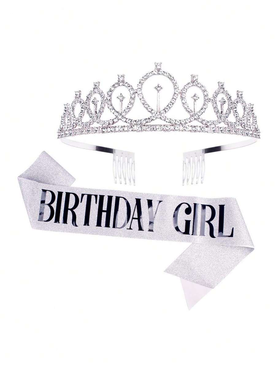 2pcs/Set Bling Rhinestone Crystal Crown Tiara Birthday Decoration Birthday Satin Sash Party Supplies