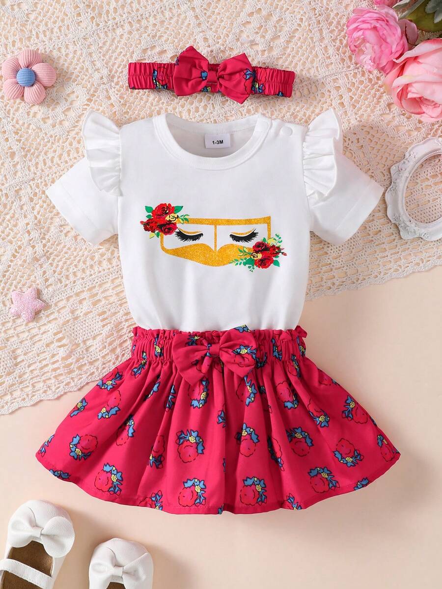 H HIBOBI 3pcs/Set Baby Girls Spring/Summer Short Sleeve Eid Mubarak Printed Bodysuit, Skirt And Headband Set