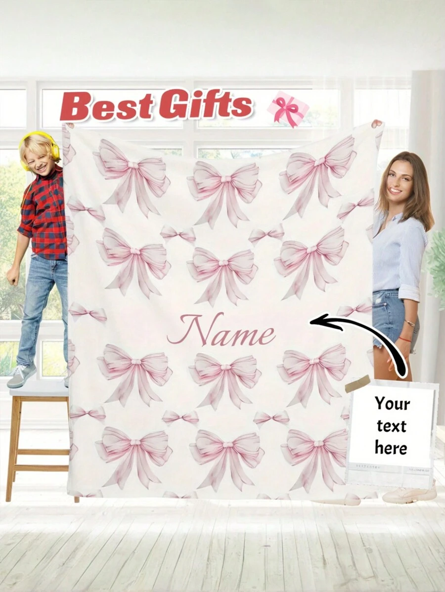 1pc Creative Custom Name Personalized Bow Print Flannel Blanket - Perfect Holiday Gift Birthday Gift For Family And Friends - Comfortable All Seasons Multifunctional Blanket Suitable For Sofa, Bed, Office, Camping, Travel,Suitable For Mother's Day Gifts