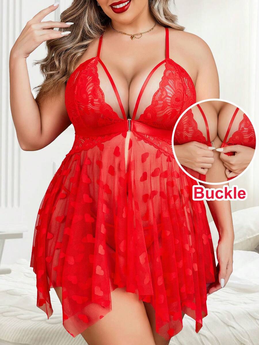 Plus Size Lace Camisole Nightgown, Women Teddy Bear Pajamas V-Neck Mesh Sleepwear Front Slit Nightdress