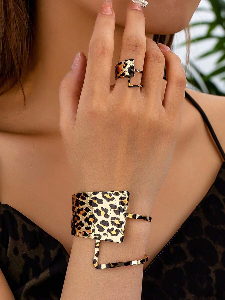 1 Set Animal Leopard Print Cuff Bangle Chunky Ring Bracelet Set For Women