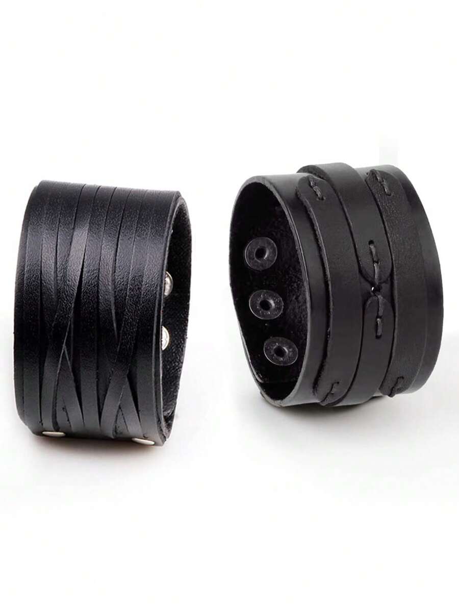 Black Punk Rock Style Layered Bracelet Wide PU Leather Wristband Bracelet - Adjustable, Edgy Fashion Punk Bracelet For Men Couples And Party