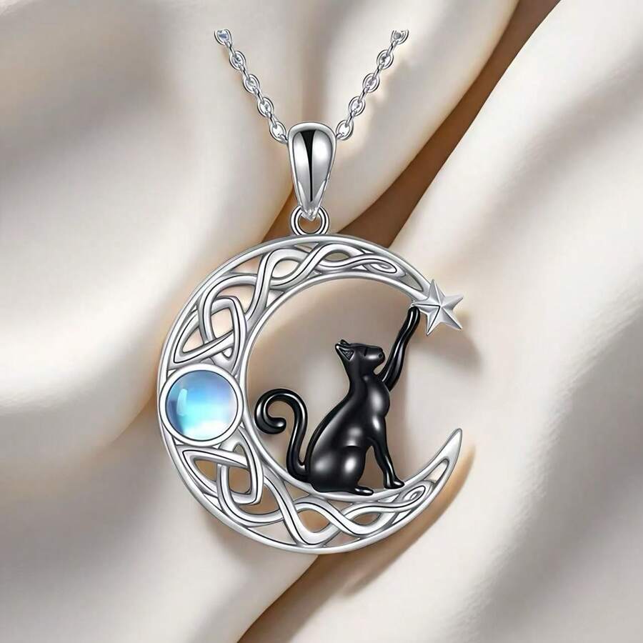 Fashionable Simple Moonlight Stone Moon Star Black Cat Pendant Necklace Women's Sterling Silver Holiday Gift Jewelry Creativity Suitable For Daily Clothing