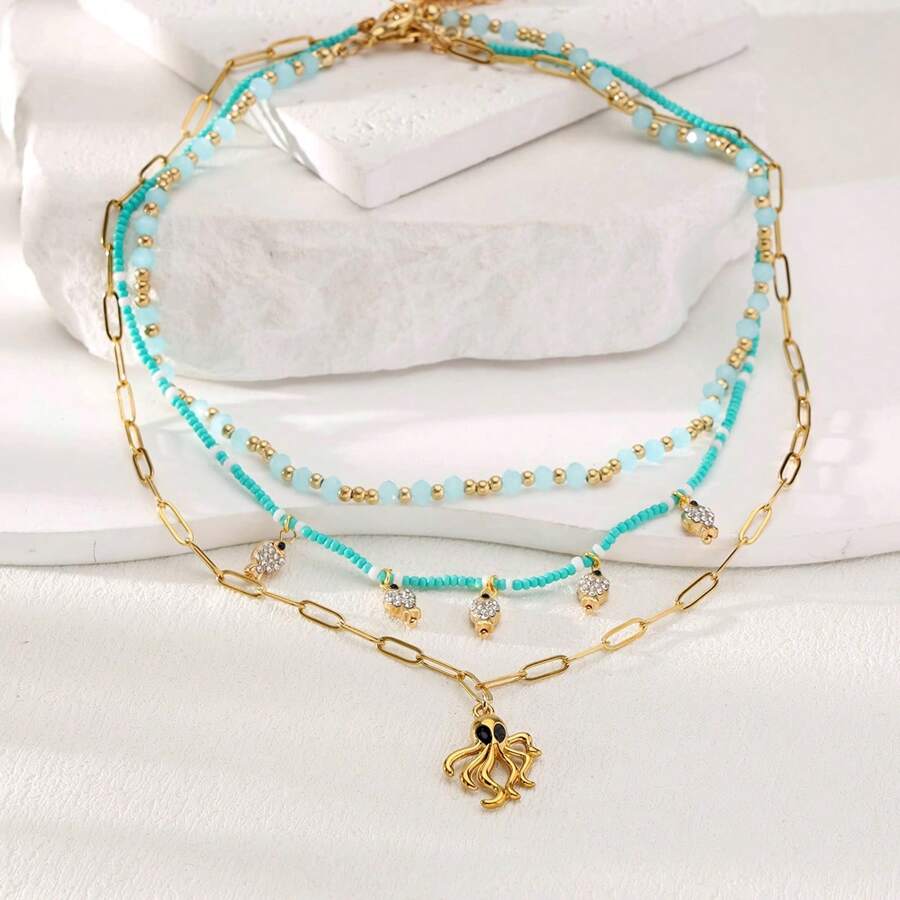 1 Set Handmade Bohemian Style Blue Jewelry Necklace Set, Featuring Octopus And Fish Pendants, Multi-Layer Necklace Suitable For Women, Versatile Beach Holiday Accessory Jewelry