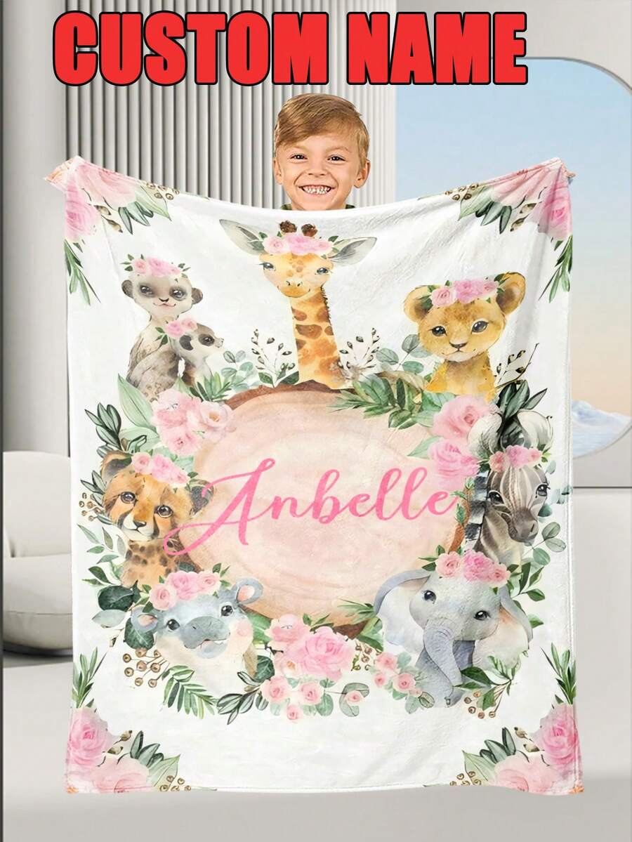 1pc Custom Personalized Color Name Throw Blanket, With Pink Animal Party Blanket For Girl Boy Great Holiday Gift For Daughter,Son,Classmates, Friends,Super Soft Warm Gorgeous Cozy, For All Seasons, Suitable For Indoor, Camping, Air-Conditioned Room, Sofa, Living Room,Bedroom,Home,Halloween, Ideal Gift For Children's Day, Christmas, Birthday