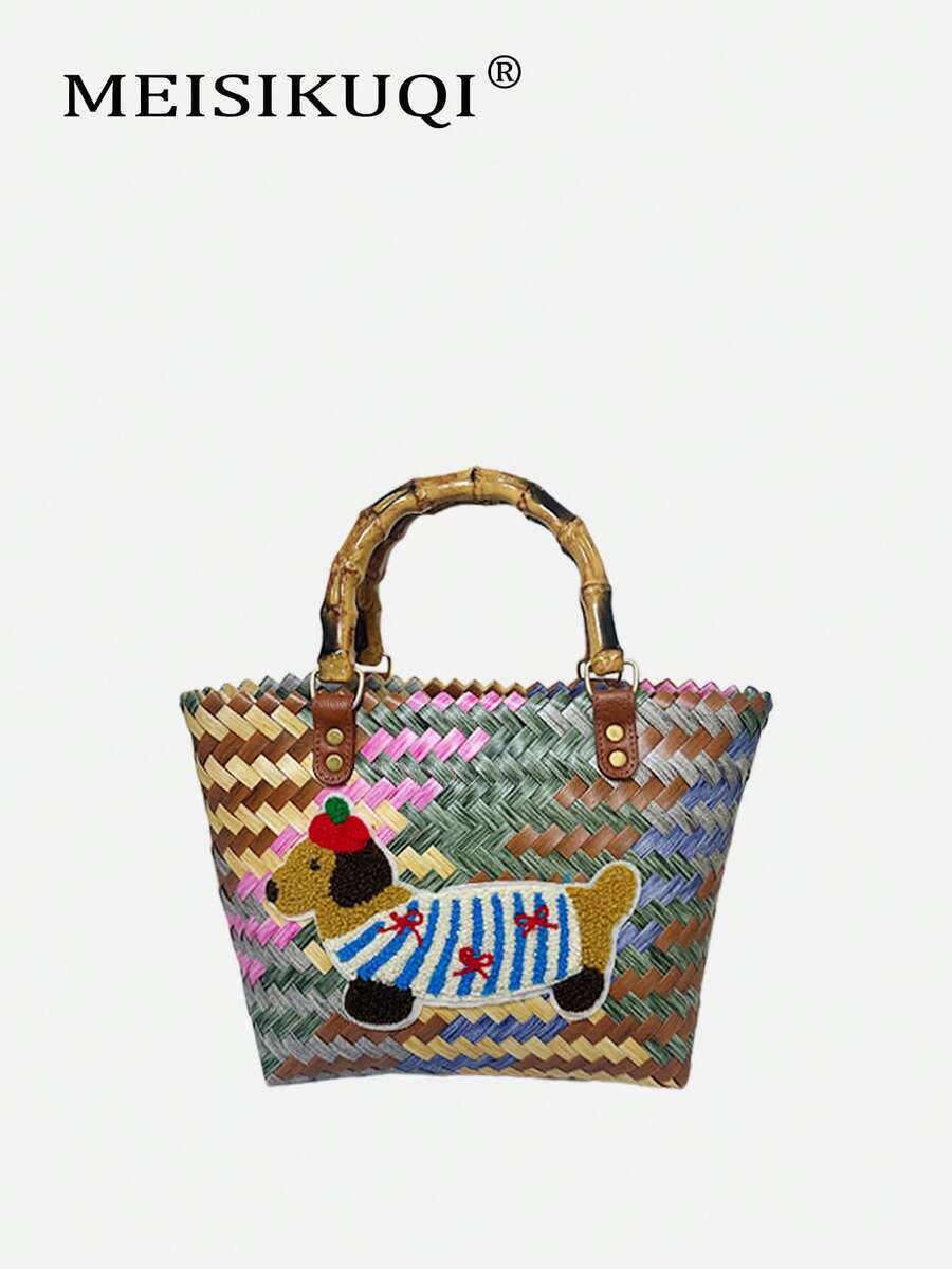 2025 New Cute Dachshund Woven Vegetable Storage Basket, Random Color & Position, Suitable For Work Commuting Bag, Vintage Wicker Handbag