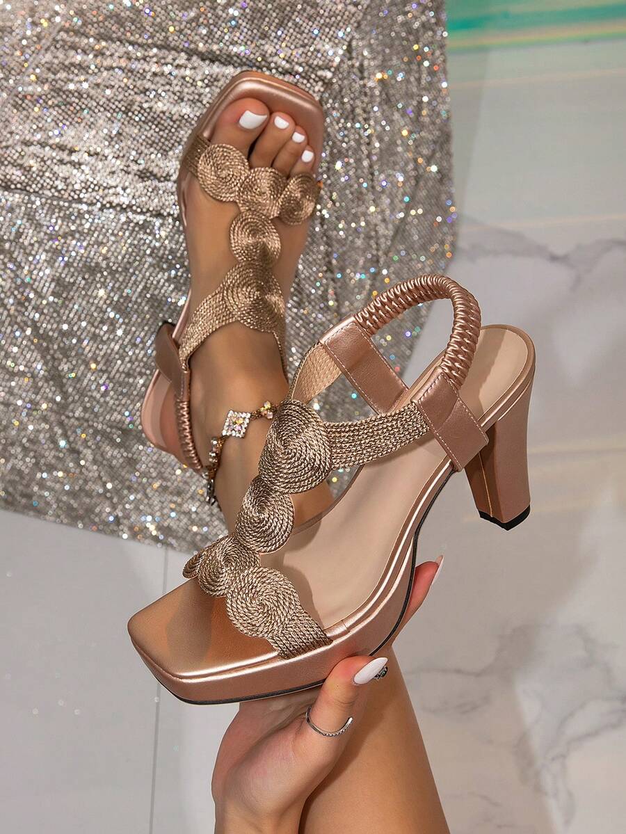 Women's Champagne Color Platform Ankle Strap Sandals, Embroidery Woven Design Chunky Heel Thick Bottom Roman Summer Dress Shoes