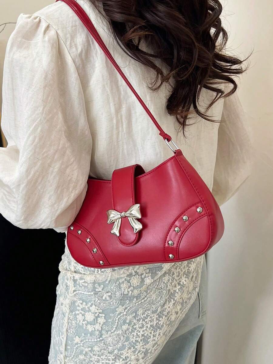 New Fashion Casual Shoulder Women PU Leather Solid Black, Coffee, Khaki Bow Metal Decor Underarm Pouch Cosmetic Bag