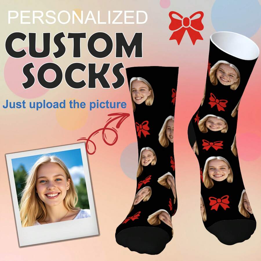 1 Pair 2025 New Bow Custom Socks, Custom Fun Crewneck Socks (With Photos) As A Lady's Gift, Sports Socks, Men's Gift Custom Valentine's Day Birthday Gift, As A Valentine Gift, Men's Novelty Socks