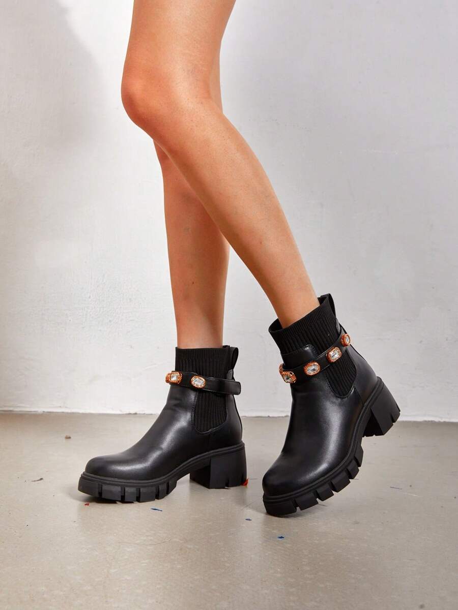 Women's Elastic Chelsea Ankle Booties Fashion Lug Sole Platform Chunky Heel Slip On Fall Heeled Short Boots Shoes