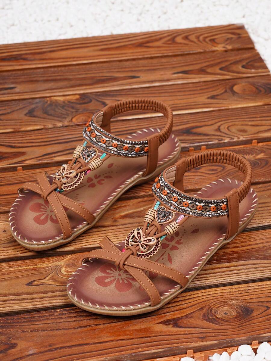 Women's New Rhinestone Peep Toe Slip-On Flat Sandals, Bohemian Style, Comfortable And Versatile, Summer