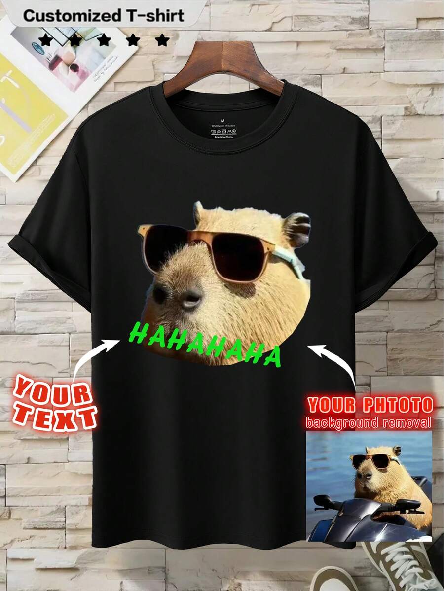 Loose Crew Neck Casual Boyfriend Style Customizable T-Shirt - Personalize With Your Own Photo (Family Portrait/Selfie/Pet/Friends/Couple/Girlfriend/Holiday Theme/Vacation Style Picture; Fashionable, Casual, Minimalist Elegant, Personalized, Unique Design, Daily Versatile, Capsule Wardrobe, Streetwear; Ideal Gift For Him)