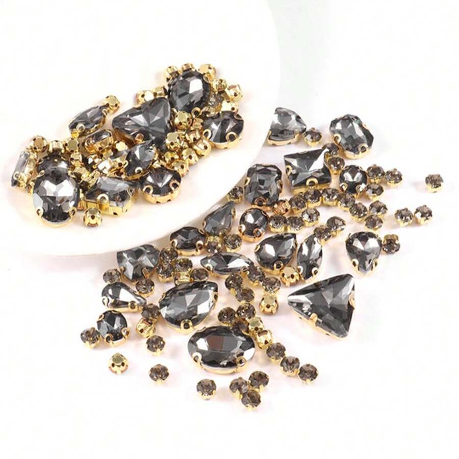 1 Pack Of Approx. 130pcs Golden-Color Metal Claw Sew On Glass Rhinestones, Mixed Shapes, Silver
