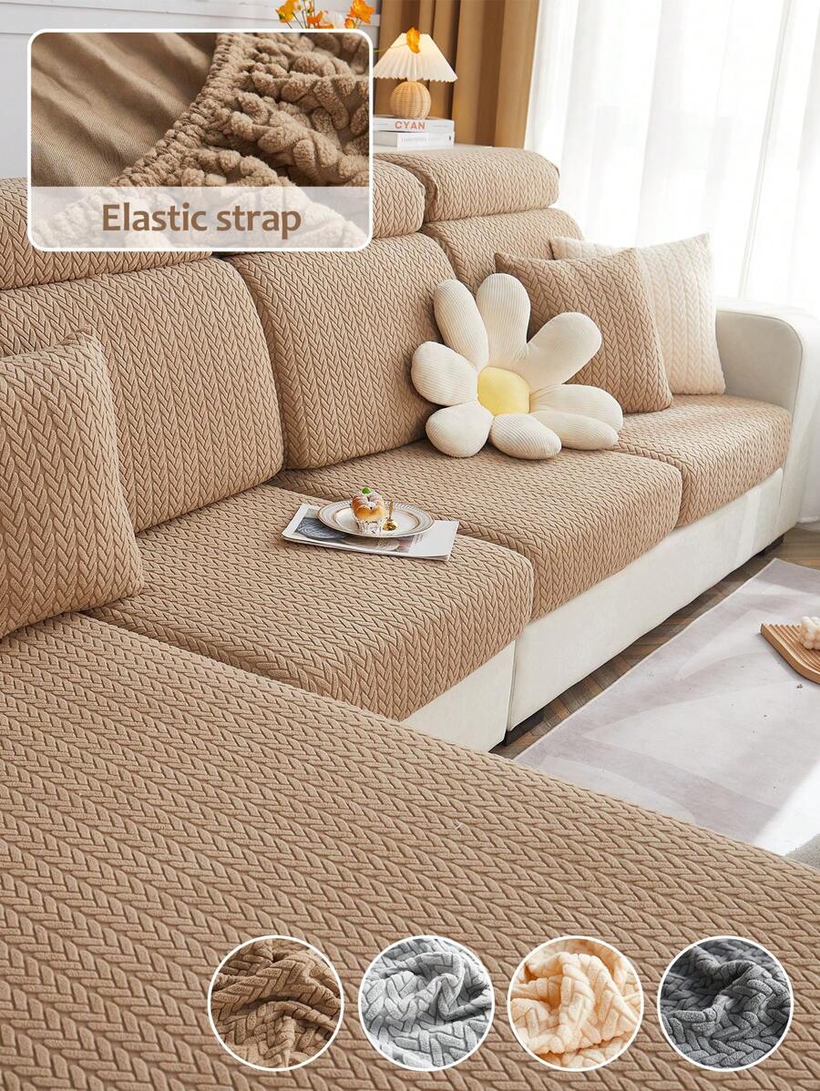 1pc Solid Color Jacquard Velvet Wheat Pattern Anti-Scratch Universal Sofa Cover, Hat-Style Sofa Slipcover, Elastic Stretch Sofa Protector, Modern Minimalist L-Shaped Non-Slip Sofa Cover, Suitable For 1/2/3/4 Seat Sofa In Living Room, Autumn/Winter