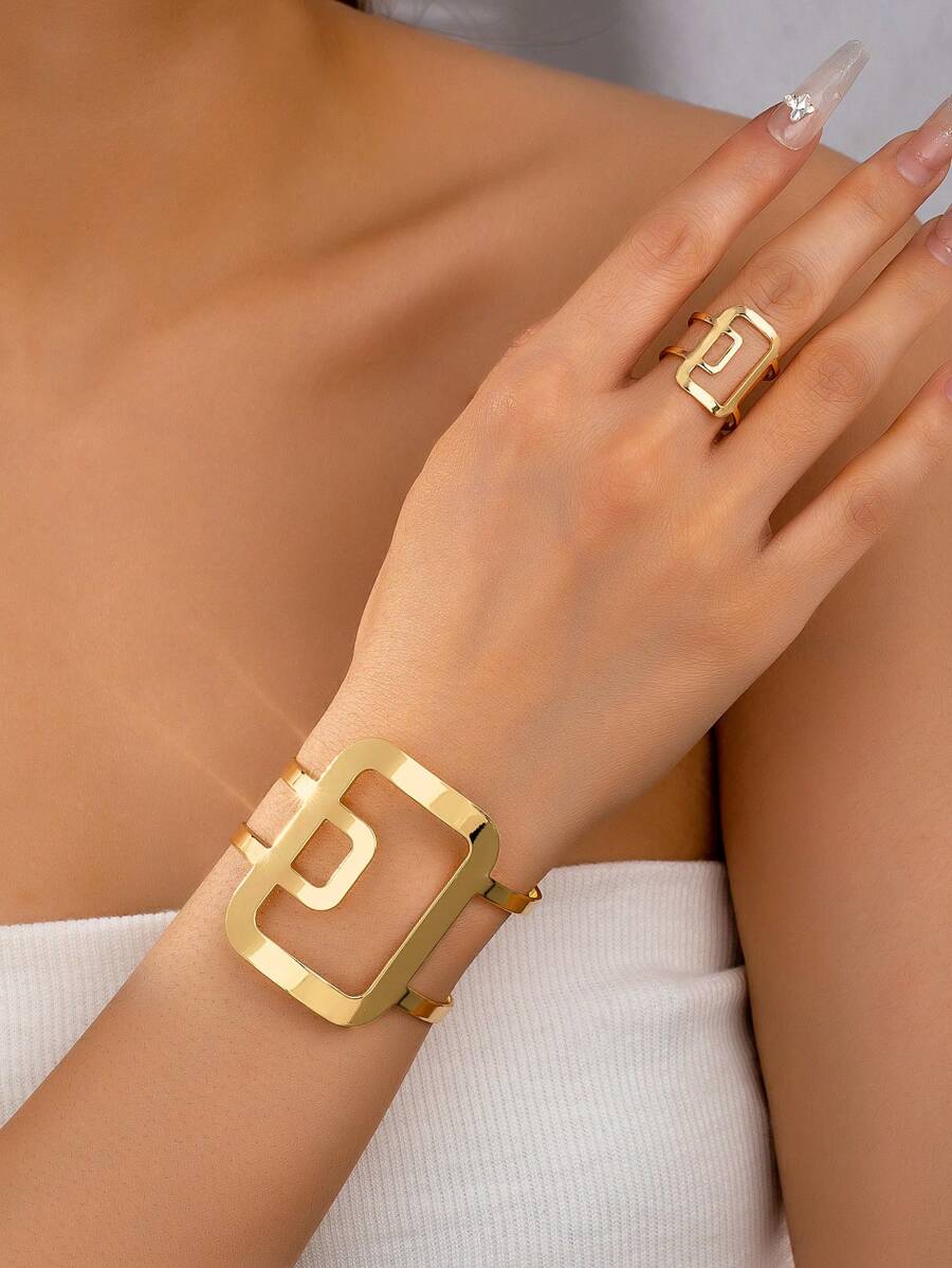 1 Set Geometric Shaped Bracelet & Ring Set, Women, Matching Thick Bracelet & Ring Set