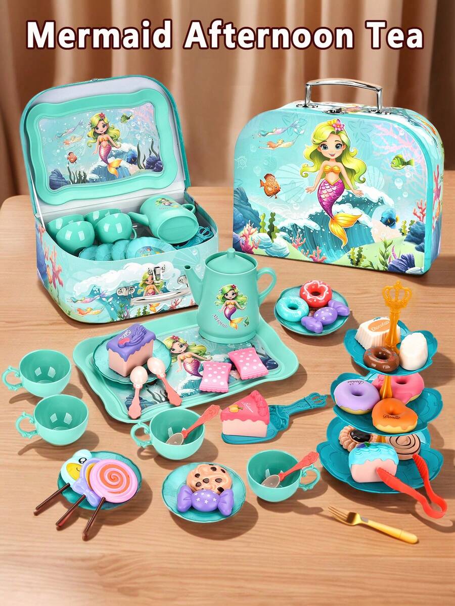 1 Set Mermaid Theme Pretend Play Tea Party Set, Including Realistic Desserts, Cakes, Coffee And Tea Service, Kitchen Play Toys Gift Set For Girls