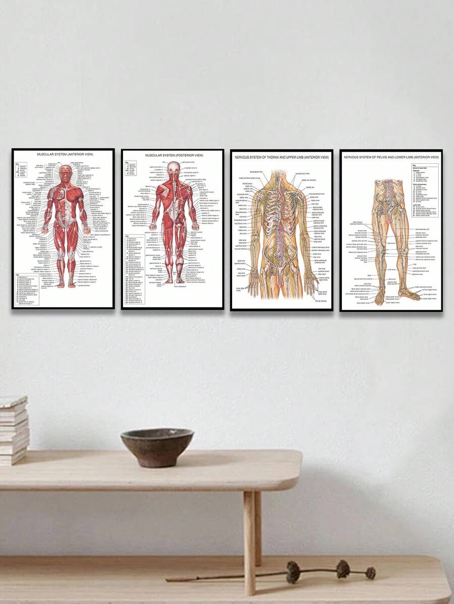 1/4pcs Human Torso And Upper And Lower Limb Nervous System Front And Rear View Posters Full Body Muscle Anatomy Illustrations Wall Art Unframed Canvas Paintings