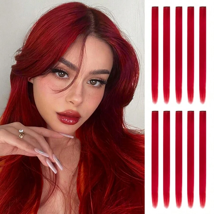 10 PCS Red Hair Extensions Clip In, Party Highlights Colorful Extension For Kids Girls Synthetic Hairpiece Straight 22 Inch