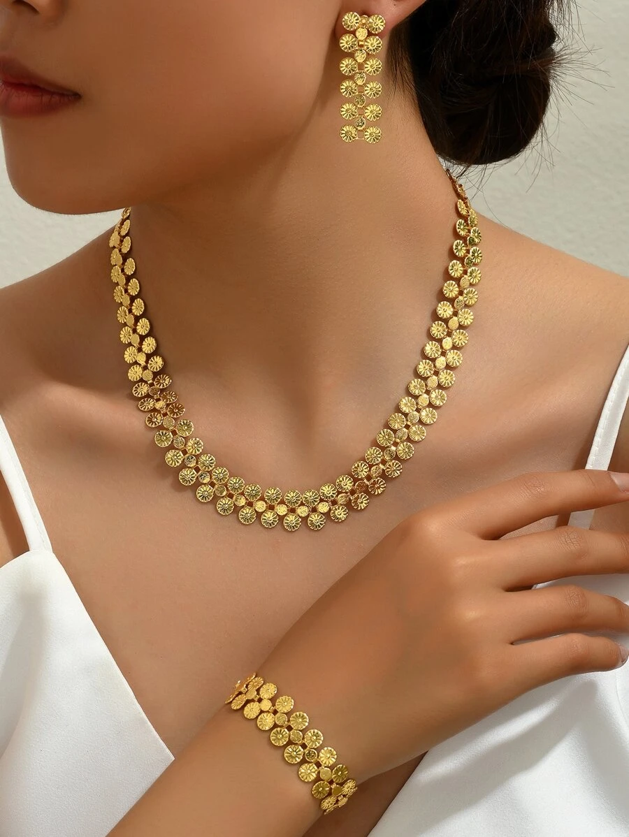 18k Gold Plated 4pcs/Set Fashionable Retro & Minimalist Atmospheric Commuting Multi-Layered Metallic Piece Dangle Earrings Bracelet Necklace Set