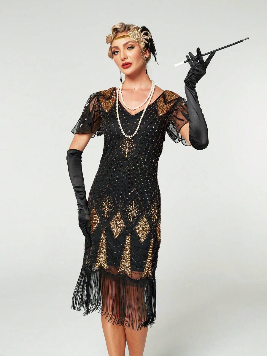 1920s Retro Flapper Fringe Party Dress With Short Sleeves (Gloves Not Included)