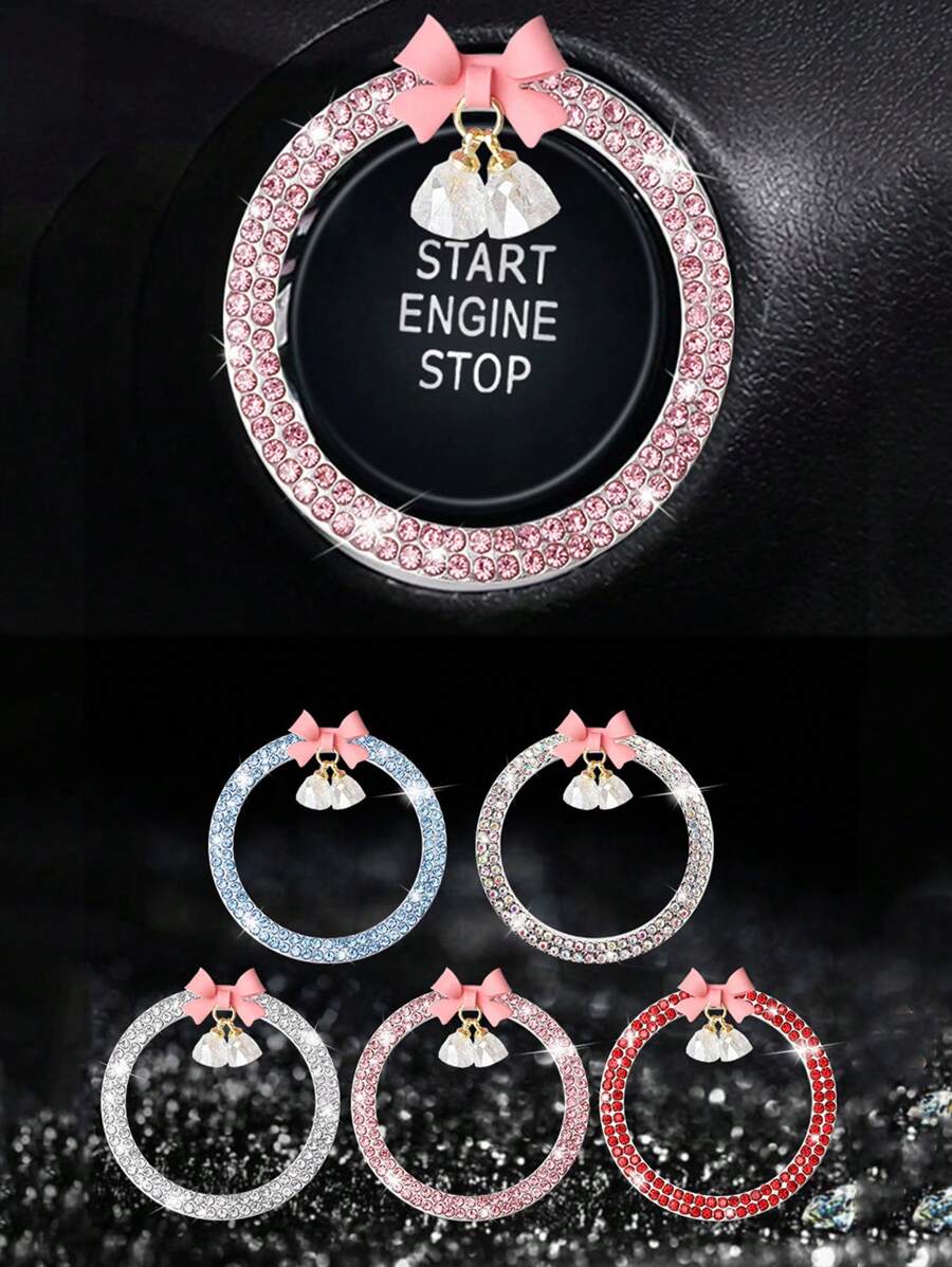 1pc Car One Click Start Decoration Sticker Interior Button Inlaid With Diamond Bow Crystal Bell Pendant Ignition Ring