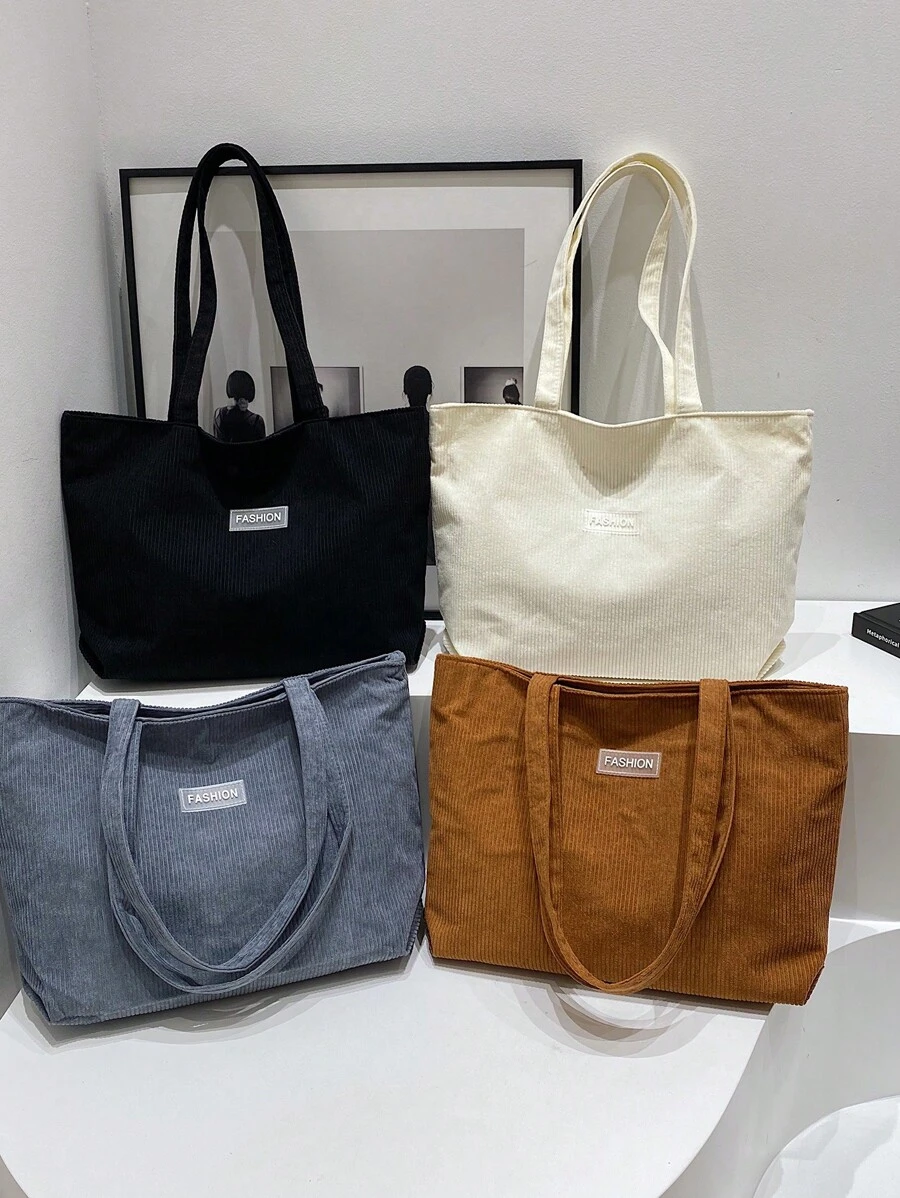 1pc Corduroy Fabric Multi-Function Tote Bag With Zipper Design, Minimalist Style, Available In White, Brown, Black, Blue