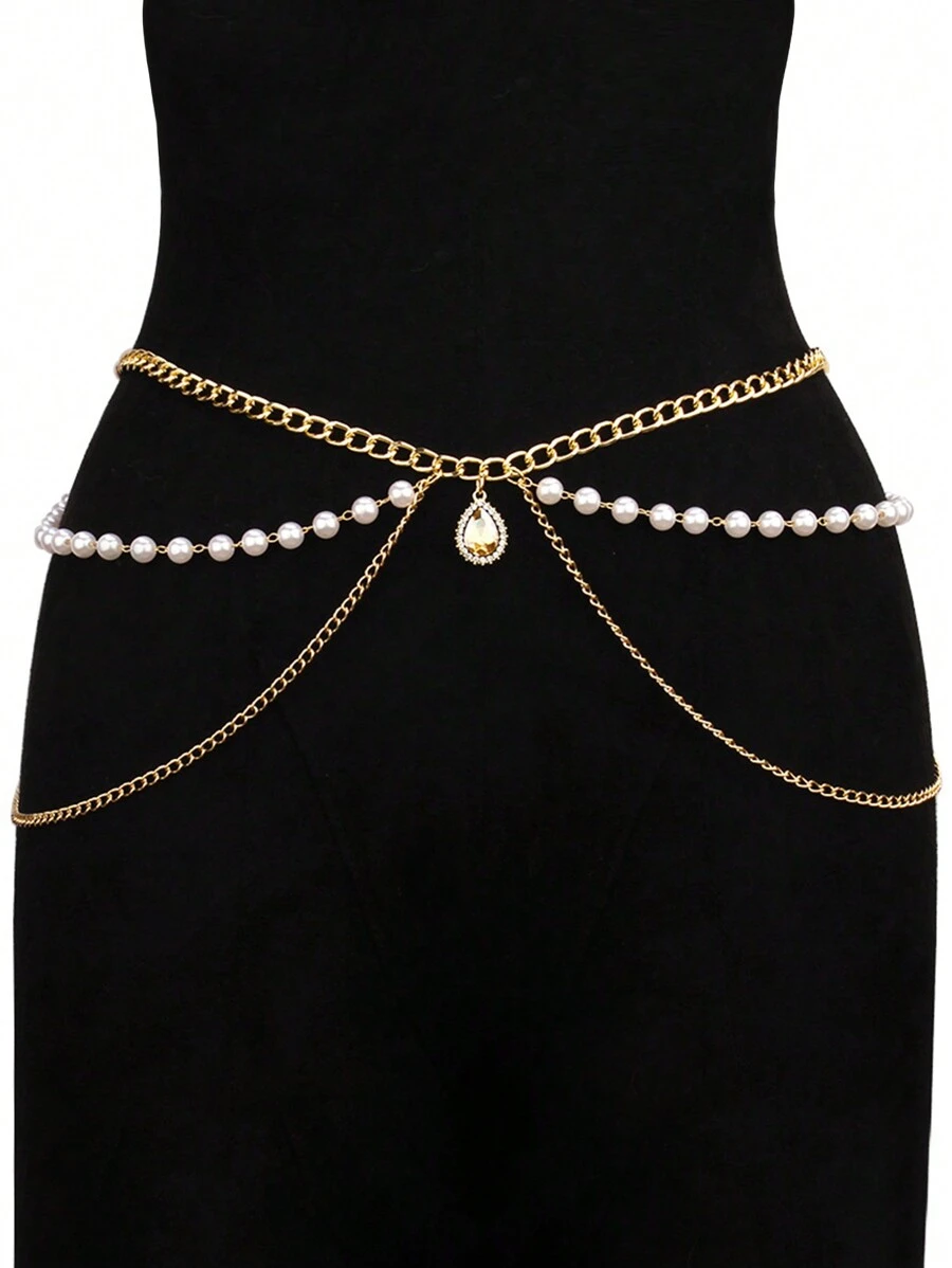 Elegant 1pc Fashionable Simple Style Gold Toned Metal Multi-Layered Waist Chain For Women, Perfect For Matching With Dresses, Faux Pearl Chain Body Chain Halloween Summer, School Fall, Autumn, Halloween