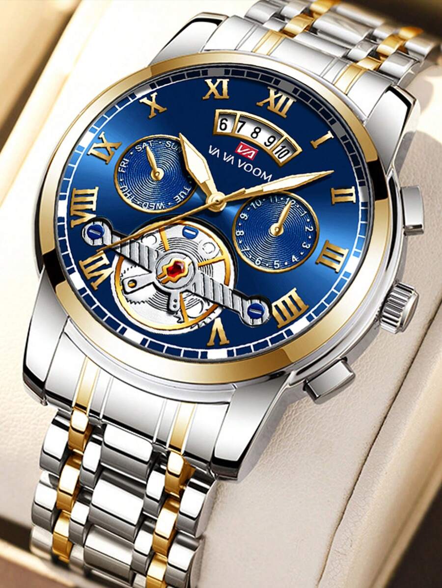 VA VA VOOM 1pc Men Watch Stainless Steel Fashion Watch Strap Analog Tourbillon Design Waterproof Calendar Sports Men's Quartz Watch