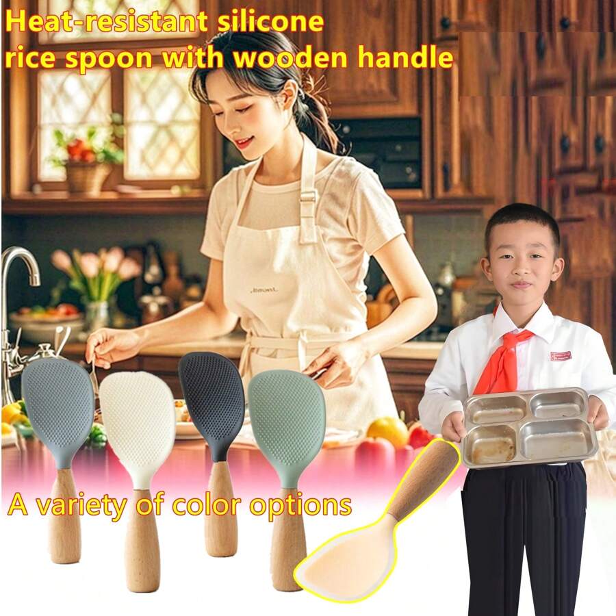 1pc Silicone Spoon With Wooden Handle, Spatula For Nonstick Pan, Heat-Insulation Heat-Resistant Spoon For Rice Cooker, For Home Kitchen School Dormitory, Practical Kitchen Tools