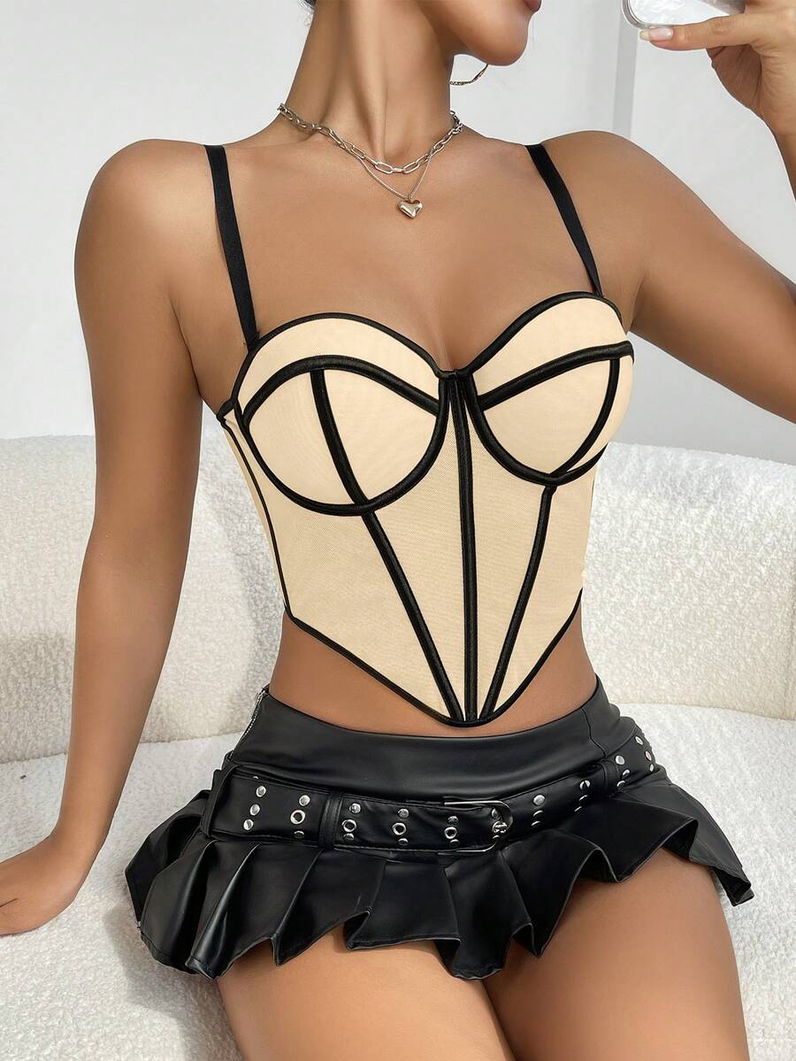 1pc Unique 3D Visual Hot Girl Net Mesh Steel Boned Bodice Bustier Crop Top With Padded Cups